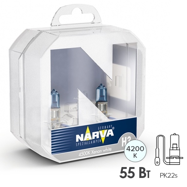 Высокотехнологичные галогенные лампы торговой марки Narva серии Range Power White обеспечивают яркий белый свет. Стильный ксеноновый эффект, получаемый благодаря цветовой температуре 4200 Кельвинов, придает автомобилю привлекательный внешний вид. Также свет этой лампы максимально приближен к естественному дневному, что делает его приятным для глаз и не вызывает усталости, в отличие от стандартных ламп. Источники света этой серии – правильный выбор для тех, кто хочет выделяться. Высокая контрастность ламп обеспечивает улучшенный обзор ночью и в неблагоприятных погодных условиях. Эти устройства относятся к типу H3 с патроном PK22s фланцевого типа и отдельным проводом. Номинальная мощность каждого изделия составляет 55 Ватт, они работают от сети автомобиля 12 Вольт. Лампы используются в головном свете легковых автомобилей. Преимуществами данного комплекта являются ярко-белый стильный свет, а также отличное соотношение эксплуатационных характеристик и срока службы. В комплект входит 2 лампы, которые упакованы в пластиковый бокс. При транспортировании упакованные лампы следует предохранять от механических повреждений.