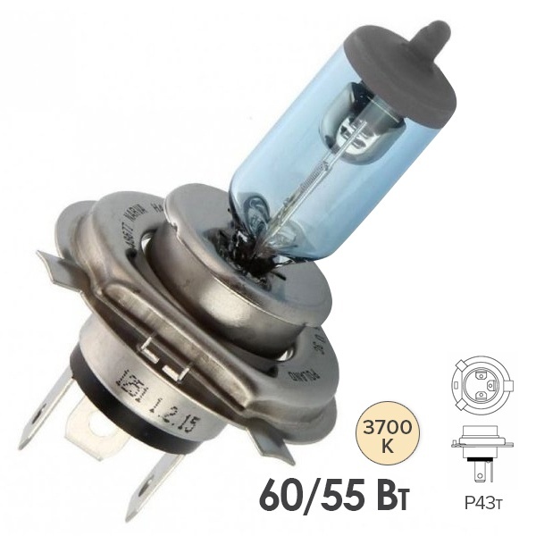 Высокотехнологичная галогенная автомобильная лампа компании Narva серии Range Power Blue с 50% увеличенной яркостью позволяет водителям видеть дальше и четче, повышая тем самым безопасность на дороге. Она обладает излучением, близким к свечению ксеноновых ламп. Яркий белый свет с голубоватым оттенком придает автомобилю более стильный вид, а цветовая температура достигает 3700 Кельвинов. Также свет этой лампы максимально приближен к естественному дневному свету, что делает его приятным для глаз и не вызывает усталости, в отличие от стандартных ламп. Это устройство принадлежит к типоразмеру Н4 с цоколем Р43t. Колба лампы изготовлена из кварцевого стекла, поэтому она выдерживает высокое внутреннее давление и обеспечивает более мощный свет. Изделие применяется для ближних и дальних фар легковых автомобилей с бортовым напряжением 12 Вольт. Его номинальная мощность равна 55 и 60 Ватт для разных режимов освещения. Главными преимуществами лампы этой серии являются мощный свет, долгий срок службы и лучшая видимость на дороге. Стильный бело-голубой свет выделит любой автомобиль среди остальных. Лампа имеет стандартную коробочную упаковку.