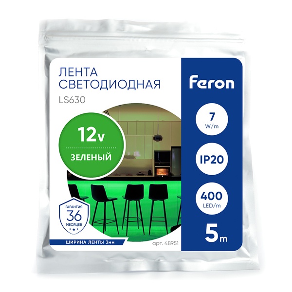 Светодиодная лента мощностью 7 Вт/м длиной 5 метров зеленого света, напряжением 12 Вольт 48951