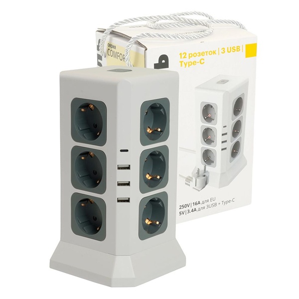 Белый электрический удлинитель 1,5 метра, колонна 12 розеток с заземлением и USB выходы 3хTypeА+1хTypeС 49991