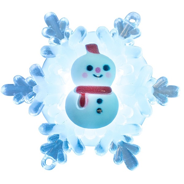 Световая фигурка "снеговик на снежинке" RGB на присоске предназначена для украшения жилых помещений с нормальным микроклиматом, не привязана к энергетическим сетям, с помощью присоски устанавливается на любые вертикальные и горизонтальные конструкции с гладкой поверхностью. Отличный подарок-сувенир на Рождество и Новый год, который доставит радость и ощущение праздника взрослым и детям. Установленная в детской комнате на шкафчик или оконное стекло, новогодняя фигурка откроет перед ребенком мир фантазий и быстро убаюкает волшебными переливами света.Описание: Новогодняя фигурка led в виде прозрачной снежинки. Цвет светодиодной подсветки – RGB.