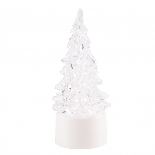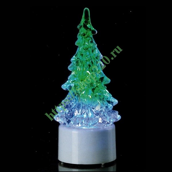 Новогодняя декоративная фигурка «Елочка маленькая» имеет прозрачный цвет, плавное переходное свечение RGB от 1 светодиода напряжением 4,5 Вольт, и питание от батарейки LR44.
