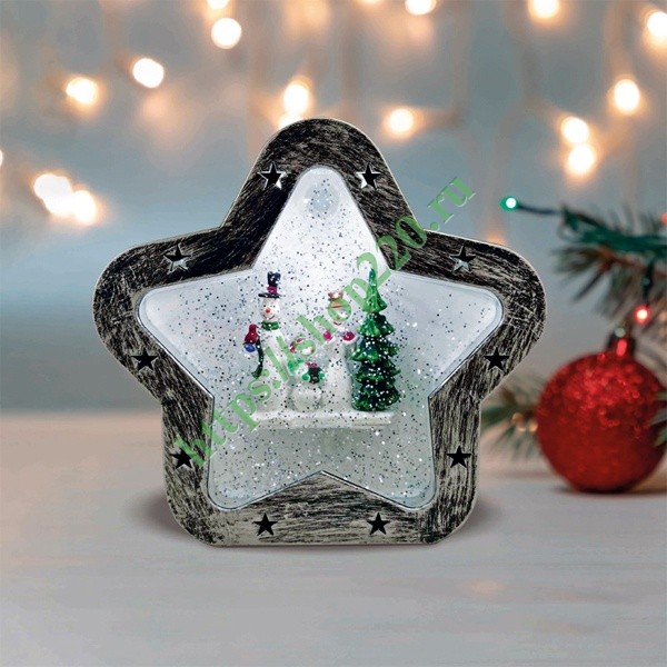Светильник декоративный новогодний «Звезда» выполнен в виде пятиконечной звездочки с плавно закругленными углами. Поверхность с имитацией старения покрыта серебристой краской. Через прозрачные стенки колбы видны фигурки трех снеговиков и новогодней ели, стоящие в вихре сверкающего конфетти. 4 диода излучают теплый свет и эффектно подчеркивают мерцание блесток. Светильник может работать от USB источника питания или быть запитан от 3 батареек типа AА (батарейки в комплект не входят), что позволяет устанавливать фонарь на любой горизонтальной поверхности без необходимости поиска ближайшей розетки.