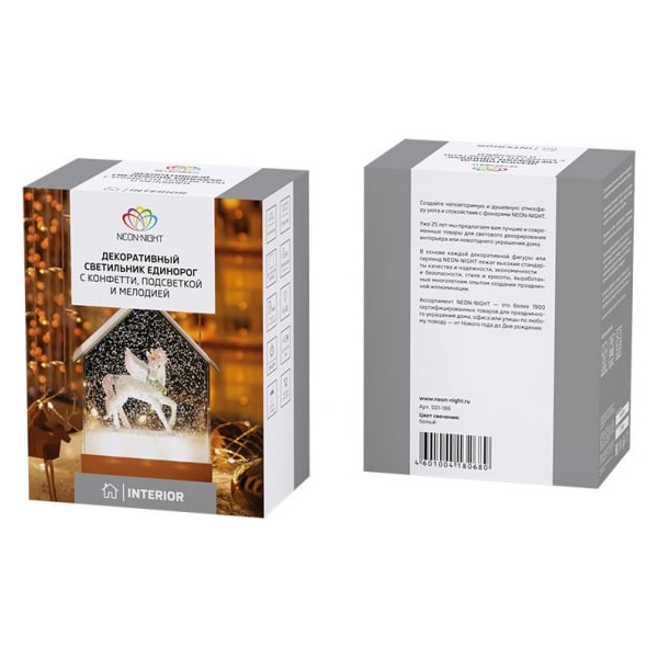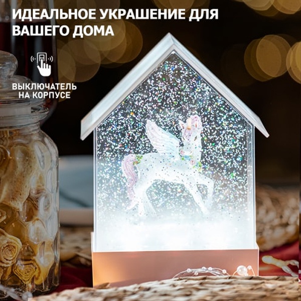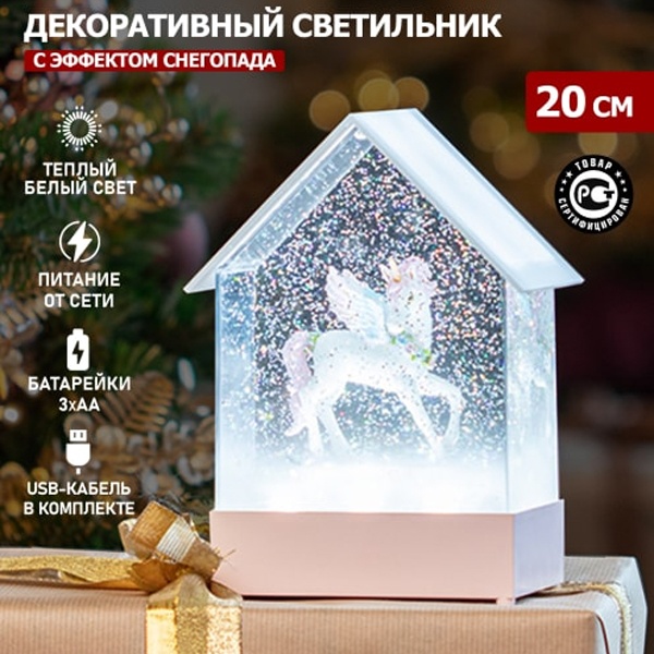Декоративный светильник «Единорог» NEON-NIGHT с приятным белым свечением придаст уют и привнесет в интерьер тепло, свет и комфорт. Светильник с фигуркой единорога станет отличным украшением детской, фотостудии или подарком на день рождения. Фонарь наполнен специальной жидкостью и конфетти, которые при включении начинают циркулировать, создавая атмосферу праздника и уюта. Оригинальная успокаивающая мелодия поможет отвлечься от потока мыслей, расслабиться после насыщенного дня и подготовиться ко сну. Общая высота светильника 20 см. Питание от 3 батареек типа AА (батарейки в комплект не входят) позволяет устанавливать фонарь на любой горизонтальной поверхности без необходимости поиска ближайшей розетки. Возможна работа от USB (кабель входит в комплект).