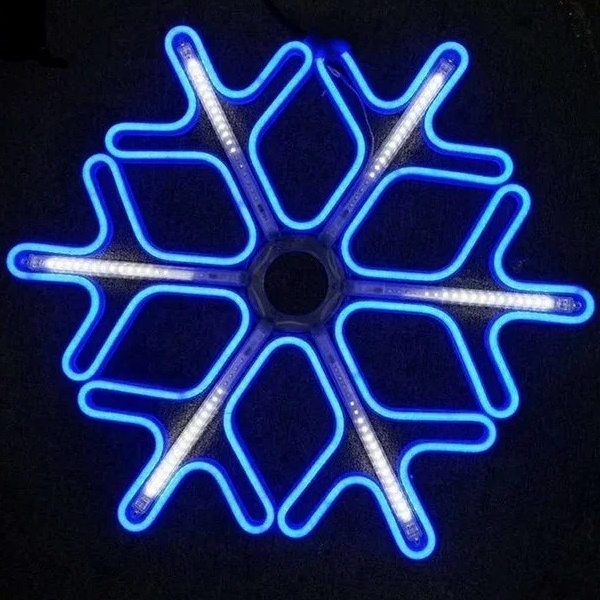 Фигура «Снежинка» изготовлена из гибкого неона, который закреплен на металлическом каркасе.Такие фигуры используются для украшения фасадов и стен как коммерческих, так и частных домов и дач, торговых центров, елей, витрин магазинов, кафе и многих других объектов.Фигура имеет в комплекте шнур питания с вилкой, благодаря чему удобна в подключении.Наличие специального «ушка» на металлическом каркасе заметно облегчит ваш монтаж.«Снежинка» имеет размер 60х60 см. Цвет свечения синий и белый.