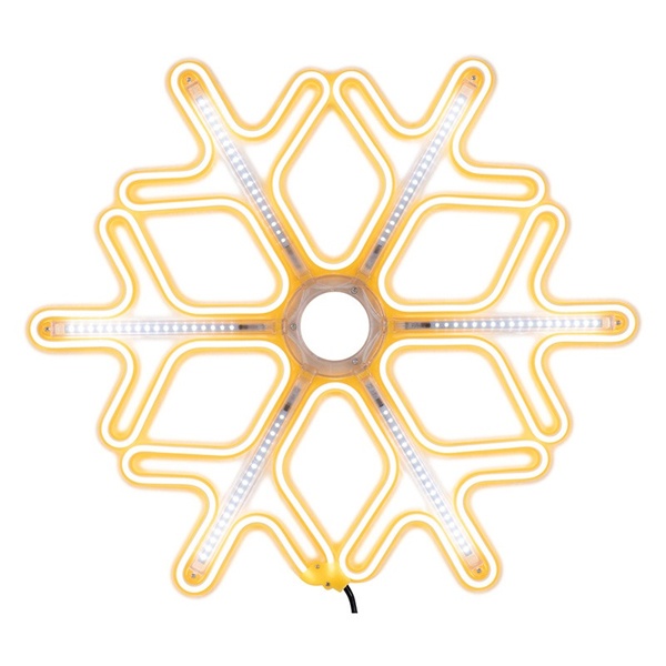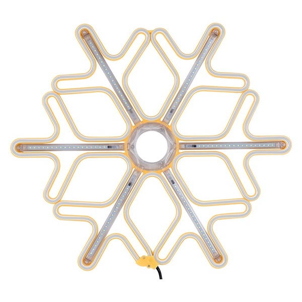 Фигура «Снежинка» изготовлена из гибкого неона, который закреплен на металлическом каркасе. Такие фигуры используются для украшения фасадов и стен как коммерческих, так и частных домов и дач, торговых центров, елей, витрин магазинов, кафе и многих других объектов. Фигура имеет в комплекте шнур питания с вилкой, благодаря чему удобна в подключении. Наличие специального «ушка» на металлическом каркасе заметно облегчит ваш монтаж. «Снежинка» имеет размер 60х60 см, выполнена из теплого белого неона и белых светодиодных лучей.