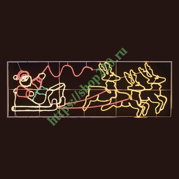 Фигура световая «Олени везут Санта Клауса на санях», выполненная из дюралайта. В качестве световых элементов использованы лампы накаливания. Световая фигура используется для оформления площадей, предназначенных для праздничных новогодних и рождественских гуляний, размещается на фасады зданий официальных учреждений и развлекательных комплексов.