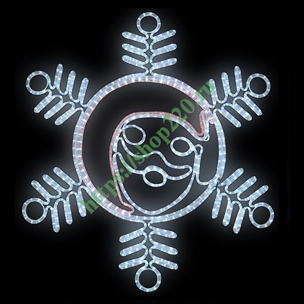 Снежинка с Дедом Морозом имеет размер 107*95 см и Белое с Красным свечение светодиодов.