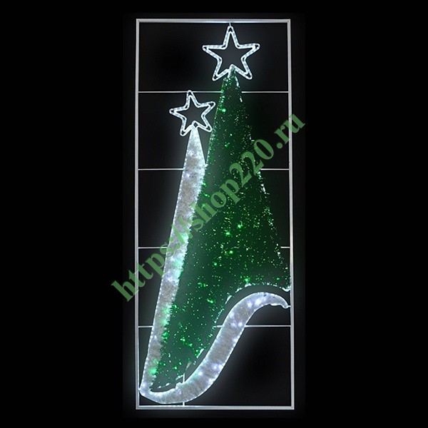Описание: Новогодняя светодиодная фигура, расположенная на арматурном каркасе, в виде прямоугольного панно, изображает две елки, стоящие друг за другом. На макушке деревьев расположены пятиконечные звезды. Цвет свечения – белый, зеленый.