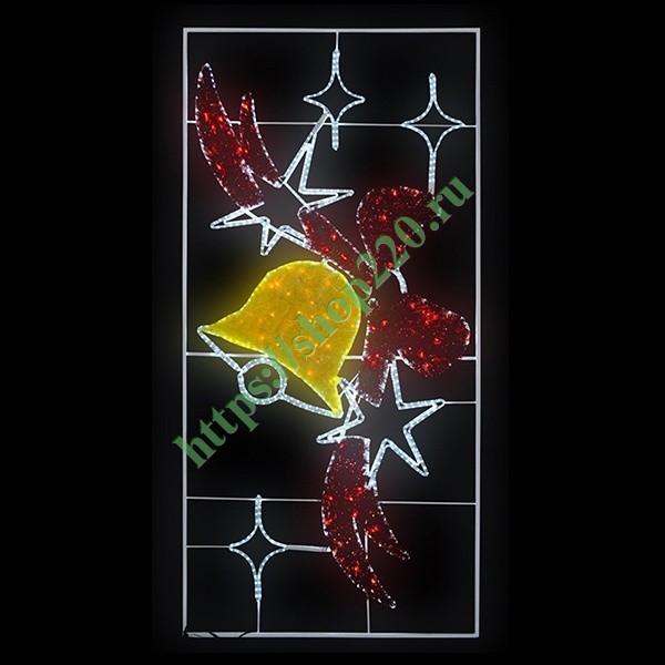 Описание: Новогодняя светодиодная фигура, расположенная на арматурном каркасе, в виде панно, изображает желтый колокольчик с красным бантом в окружении белых звезд. Общая длина дюралайта – 32 метра.