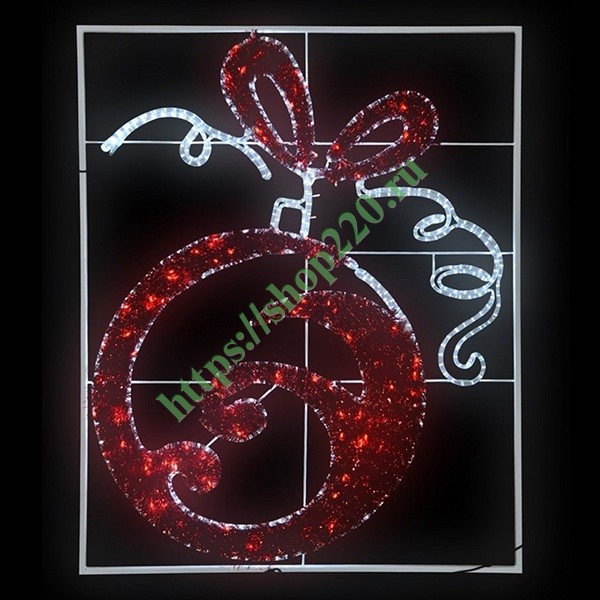 Новогодняя светодиодная фигура «Елочный шар»изготовлена из дюралайта (прозрачный гибкий шнур из полимера, внутри которого встроены светодиоды). Эта светодиодная фигура для улицызакреплена на специальной решетке, размах которой составляет 1.2 м, высота 1.5 м.