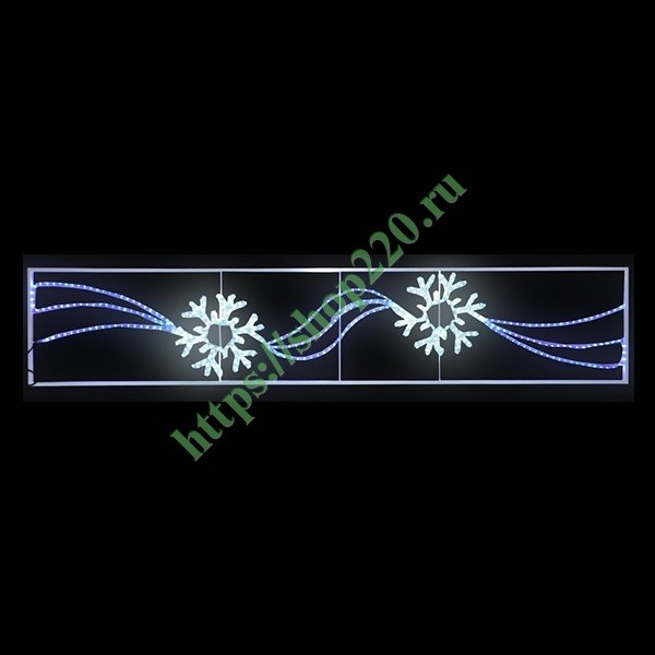 Снежинки изготовлены из прозрачного гибкого шнура из полимера, внутри которого встроены светодиоды общей мощностью 34 Ватт. Эти новогодние светодиодные фигуры закреплены на специальной решетке, размах которой составляет 2.5 м, а высота 0.5 м.