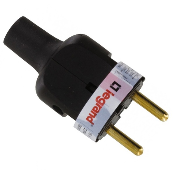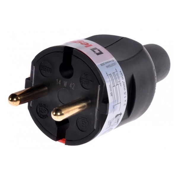 Резиновая вилка (50181) черного цвета с двумя контактами на 16 Ампер для подключения оборудования класса II 050181