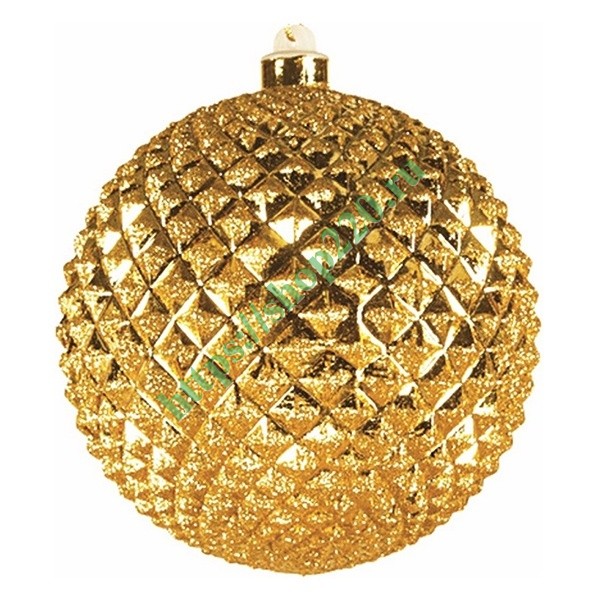 Описание: Новогодняя фигура для елки. Форма – шар. Поверхность – рифленая, глянцевая, золотистого цвета.