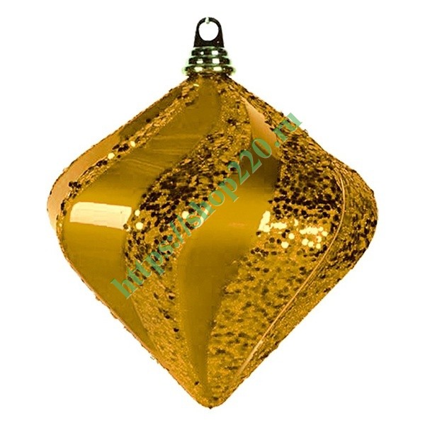 Яркая новогодняя фигура «Алмаз» золотого цвета, имея крупные размеры 250 мм, хорошо подходить для украшения крупных елок, обладает глянцевой светоотражающей, вперемешку с полосами с блестками темного цвета, поверхностью и надежным креплением для специальной подвески, с помощью которой украшение фиксируется к веткам елки и другим предметам.
