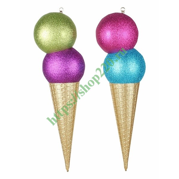 Объемные елочные украшение, выполненное в виде мороженного, будет приятно особенно яркими цветами детям, поэтому они всегда пользуются большой популярностью. Фигура «Мороженное» относится к таким игрушкам, завораживая своей объемной красотой. Представляет собой несколько объединенных вместе выгнутых элементов синего цвета с блестками, образуя объемную фигуру.