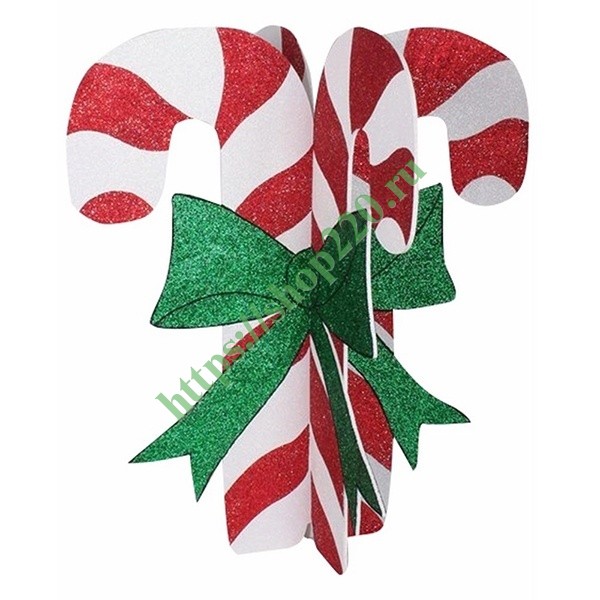 Описание: Новогодняя фигура представляет собой четыре плоских проекции рождественского лакомства – карамельной палочки, окрашенных в бело-красные цвета и украшенных зелеными бантами. Специальное напыление на поверхности изделия (в виде блесток) хорошо отражает световые лучи и делает фигуру особенно заметной.