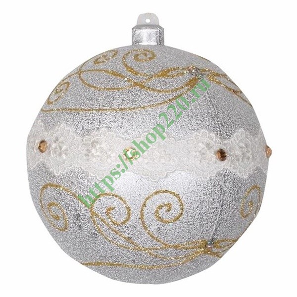 Описание: Фигура «Шар с узорами» представляет собой полую сферическую форму, верхняя часть которой оборудована специальным подвесом. Ближе к полюсам шар украшен золотым узором. По экватору располагаются декоративные элементы в виде стразов. Поверхность шара покрывают светоотражающие блестки, имитирующие битое стекло. Попадая в световой луч, исходящий от постороннего источника, покрытие создает иллюзию собственного свечения фигуры.