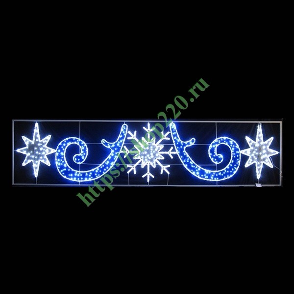 Описание: Новогодняя светодиодная фигура монтируется на специальный каркас из металлической арматуры, представляет собой вытянутую по горизонтали конструкцию с изображением снежинки (центр) и двух восьмиконечных звезд (по краям). Цвет свечения – белый.