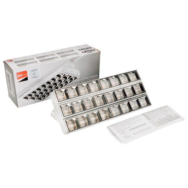 Линейный трехсекционный поворотный LED светильник для трековых систем JazzWay PTR 22R, угол рассеивания 60 градусов, мощность 60Вт, теплый свет, белый корпус длиной 280 мм 5039490