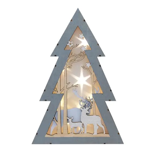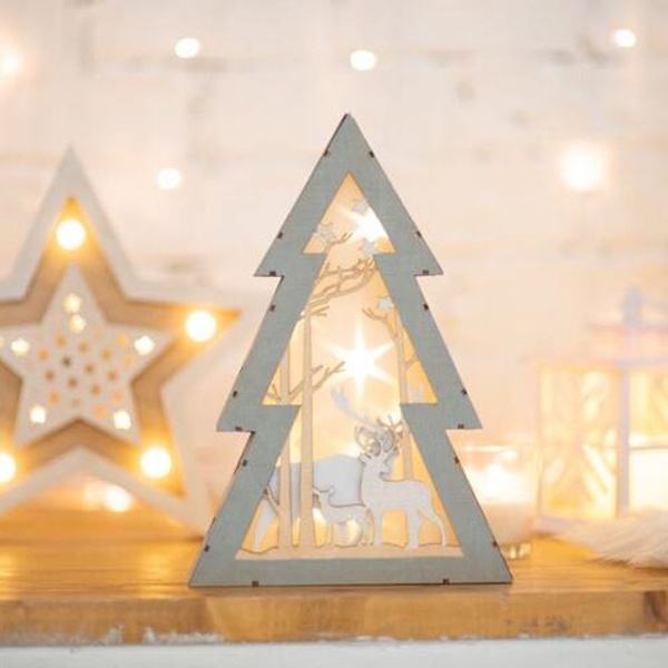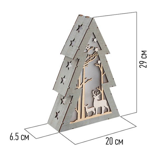 Деревянная фигурка "Елочка" размером 20x6,5x29 см - это уникальное светодиодное украшение, созданное в виде елочки с многоуровневой композицией. Она представляет собой изящную композицию, включающую в себя резные деревья и фигуры оленей, освещенные 8 светодиодами. Теплый белый свет создает атмосферу зимней сказки, которой вы обязательно захотите насладиться.