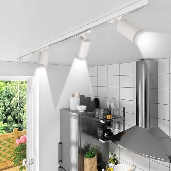 - Конструкция трековой системы обеспечивает перемещение прожекторов вдоль трека, что позволяет изменять направление света и уровень освещенности различных зон.