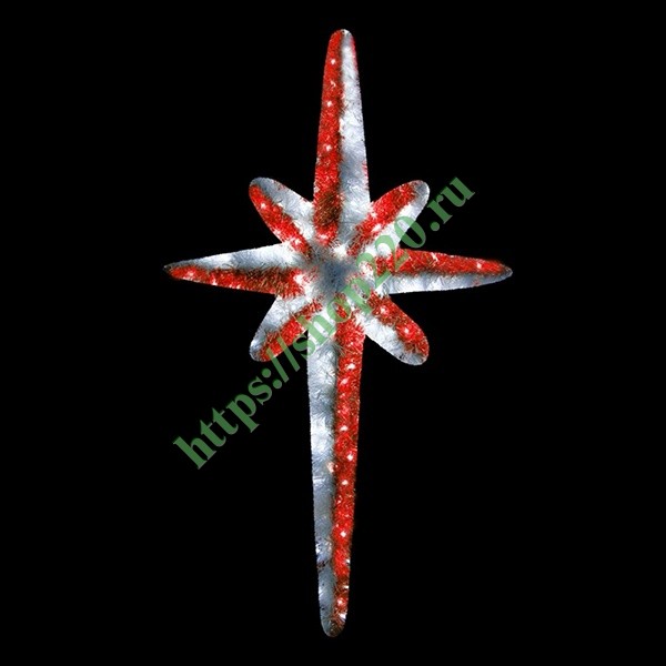Описание: Новогодняя светодиодная фигура для улиц и помещений – в форме восьмиконечной звезды, покрытой мишурой красного и белого цвета. Внутренняя подсветка – светодиодный дюралайт. Свечение – красно-белое.