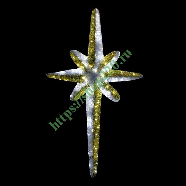 Описание: Новогодняя светодиодная фигура для улиц и помещений – в форме восьмиконечной звезды, покрытой мишурой золотистого и белого цвета. Внутренняя подсветка – светодиодный дюралайт. Свечение – бело-золотое.