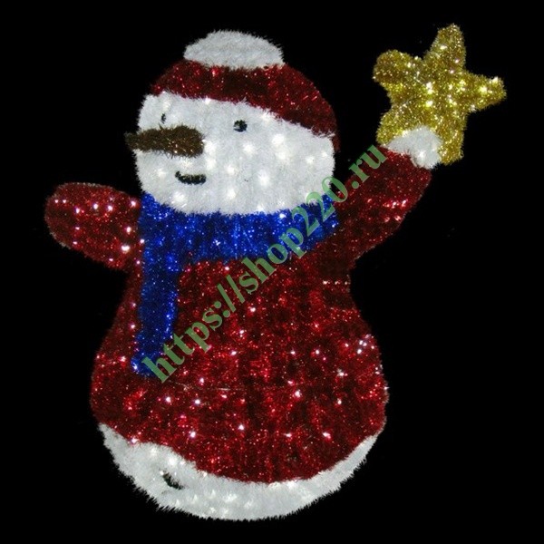 Описание: Световая led фигура для улиц и помещений, изображающая Снеговика, держащего в поднятой руке звезду, выполненная из арматурного каркаса, разноцветных комбинаций мишуры и светодиодного дюралайта. Подсветка led – белая.