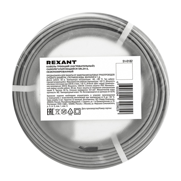 Кабель греющий пищевой саморегулирующийся Rexant SRL24-2 неэкранированный 24Вт/м бухта 50м — нагревательный кабель для поддержания температуры и защиты от замерзания трубопроводов, ёмкостей и узлов, где важна совместимость с пищевой средой. Саморегулирующаяся матрица автоматически изменяет тепловыделение в зависимости от температуры окружающей зоны: на холодных участках кабель греет сильнее, на тёплых — слабее. Это помогает снизить расход электроэнергии и уменьшает риск перегрева при частичном перекрытии или пересечении витков.