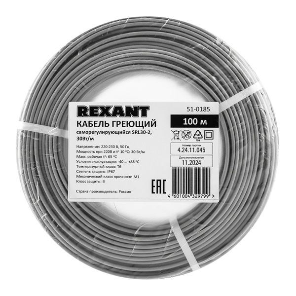 Пищевой греющий кабель REXANT без экрана, мощностью 30 Вт/м, длина в бухте 100 метров 51-0185