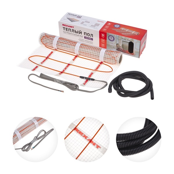 Нагревательные маты REXANT Extra с поверхностной мощностью тепловыделения 160 Вт/м2 изготовлены из тонкого двухжильного нагревательного кабеля и применяются в системах «Теплый пол» для комфортного подогрева помещений с покрытием пола из керамической плитки или другого аналогичного материала.Нагревательные маты устанавливаются под цементно-песчаную стяжку (толщина стяжки около 20 мм) или плиточный клей (толщина слоя плиточного клея 5-7 мм).