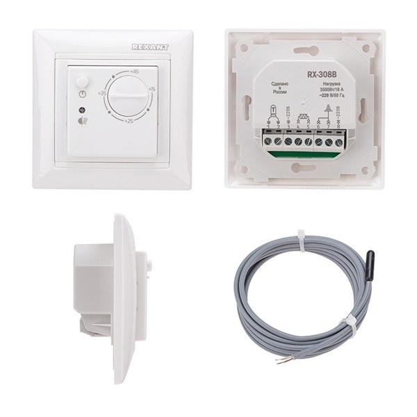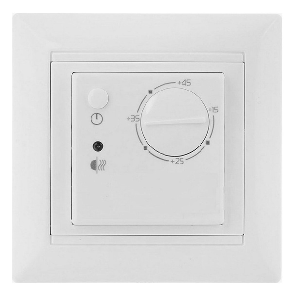 Терморегулятор обеспечивает комфортную температуру поверхности пола и температуру воздуха в помещении. Монтируется в стандартную монтажную коробку позволяя регулировать температуру в пределах +15...+45 °C. Имеет внешний датчик температуры 10 кОм (входит в комплект). Коммутируемый ток контактов 16 A.