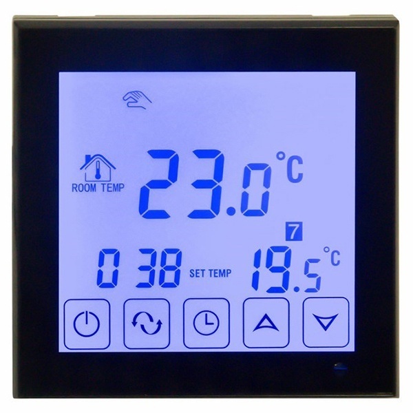Терморегулятор оснащен большим сенсорным ЖК дисплеем. Есть возможность задавать до 6 временных периодов на каждый день недели, а также выбрать ручной режим управления. С помощью специальных функций двойного контроля и двойной температуры прибор получает данные не только о температуре в помещении, но и о температуре оборудования. Когда температура в системе выше, чем установленная, терморегулятор автоматически остановит нагрев. Такой режим обеспечивает разумное потребление ресурсов и продлевает срок службы системы отопления.