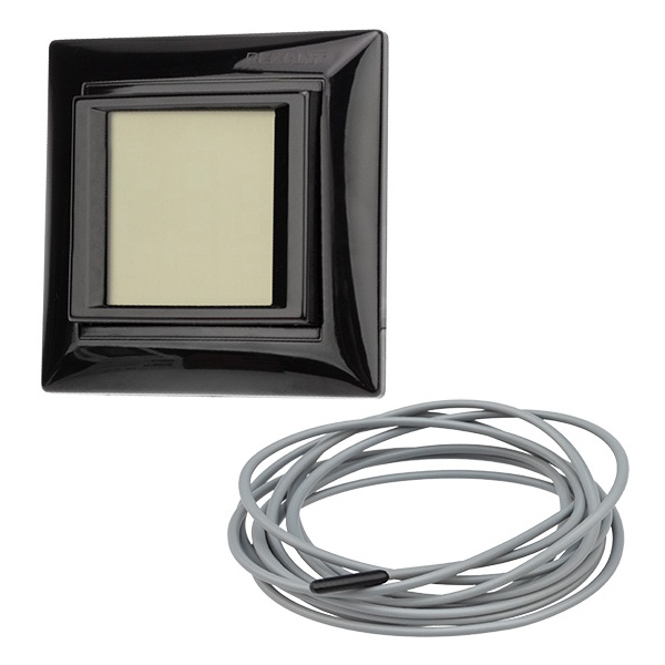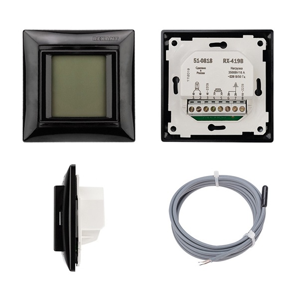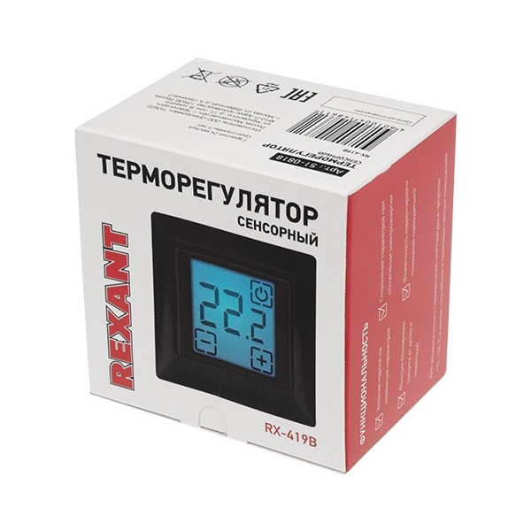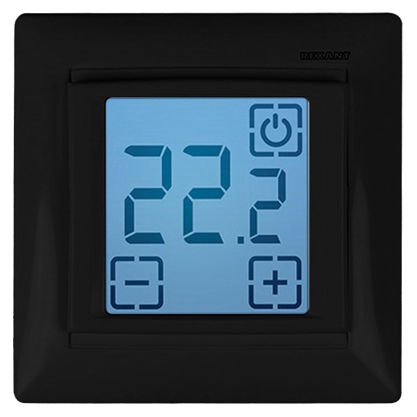 Электронный термостат RX-419BL встраиваемый, сенсорный экран, корпус черный, диапазон регулировок +5...+45 °C, коммутируемый ток контактов 16 A, внешний датчик температуры 10 кОм.