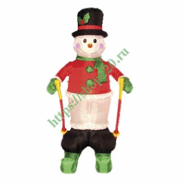 Описание: Надувная светодиодная фигура для улиц в формате 3D, изображающая снеговика на лыжах с лыжными палками.