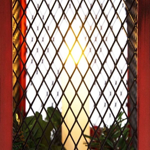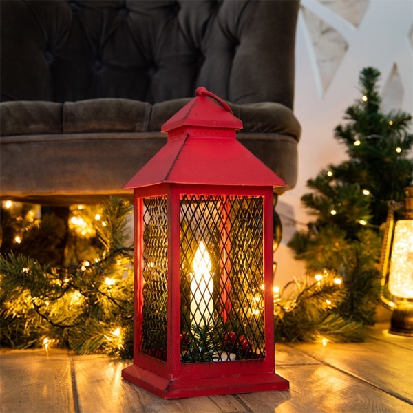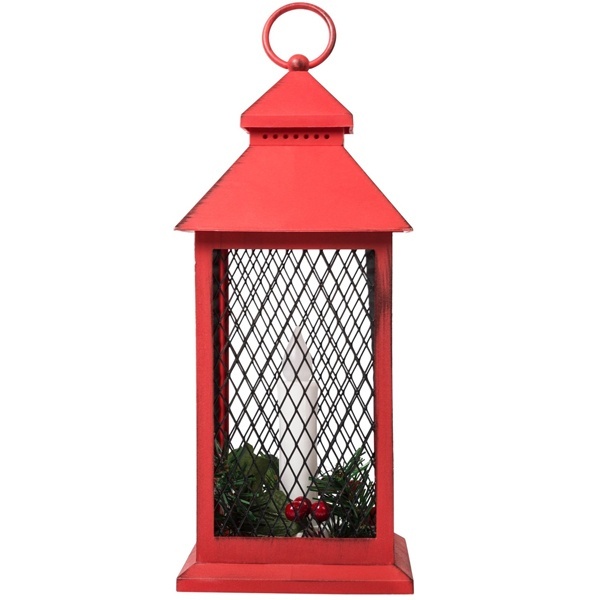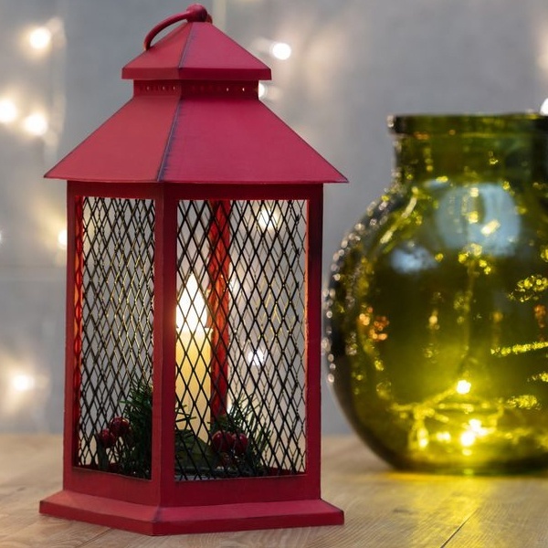• Декоративный фонарь со свечкой, красный корпус, размер 13.5х13.5х30,5 см, цвет теплый белый