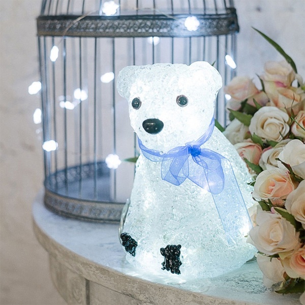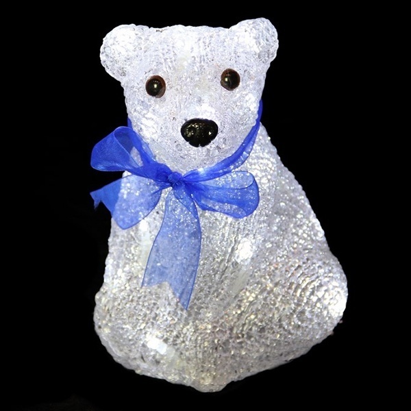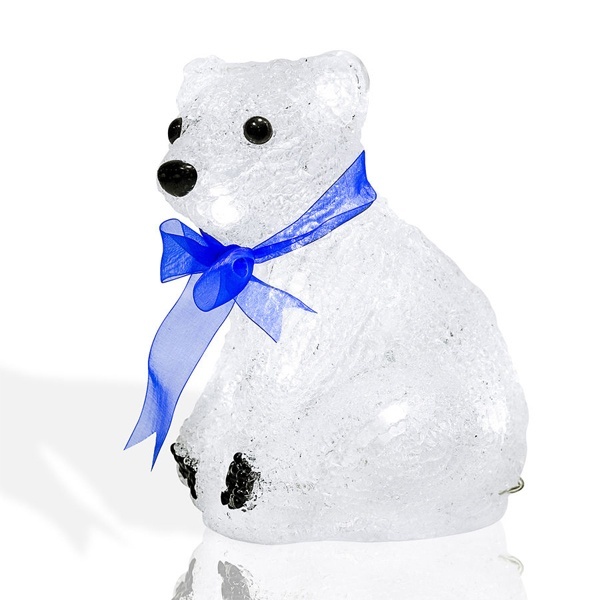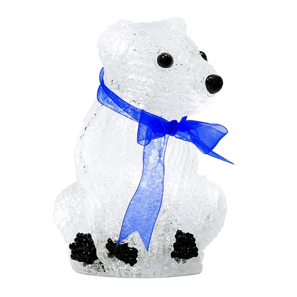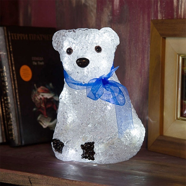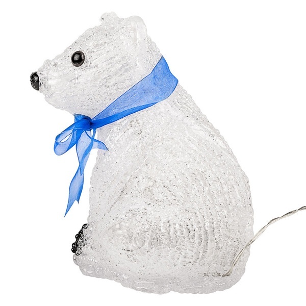 Акриловая новогодняя декоративная фигурка со светодиодной подсветкой «Белый мишка», высота которого составляет 200 мм, подсвечивается 20 диодами с напряжением 4,5 Вольт вставленными в середину корпуса мишки. Питание светодиодов производиться от 3 батареек типа AA.