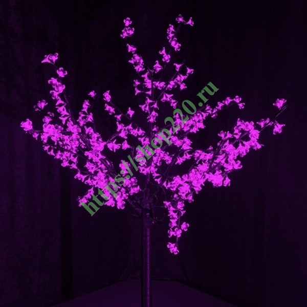 Высота дерева 1,5 м. Крона новогодней фигурки составляет 1,3м. В крону Сакуры встроено 480 фиолетовых светодиодов с общей мощностью 48 Ватт. Питание осуществляется от электросети 230 Вольт через драйвер для светодиодов, который выдает на диоды напряжение в 24 Вольт (идет в комплекте).