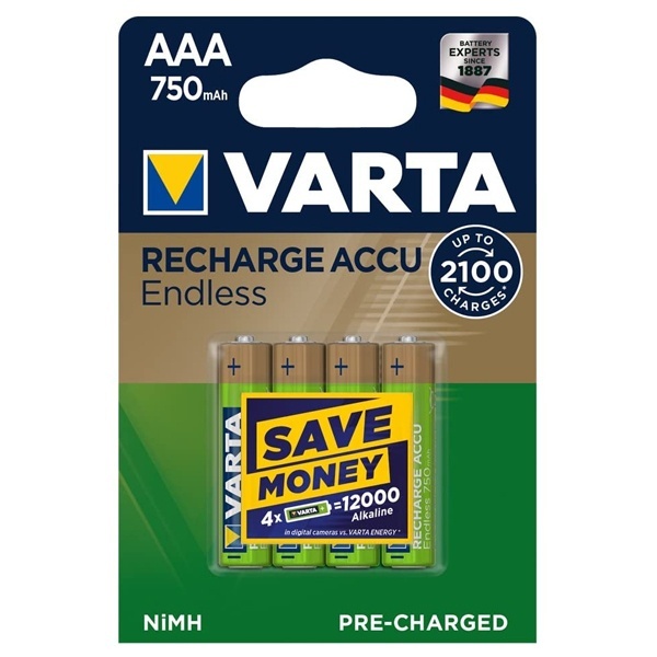 Аккумуляторы Varta Recharge Endless типоразмера AAA/HR03, емкостью 750 мАч, упаковка 4 штуки 56673101404