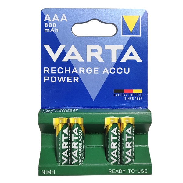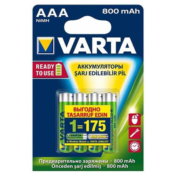 Никель-металлогидридные NiMH (Ni-MH) аккумуляторы Varta типоразмера ААА/HR03, емкостью 800 мАч, упаковка 4 штуки 56703101414
