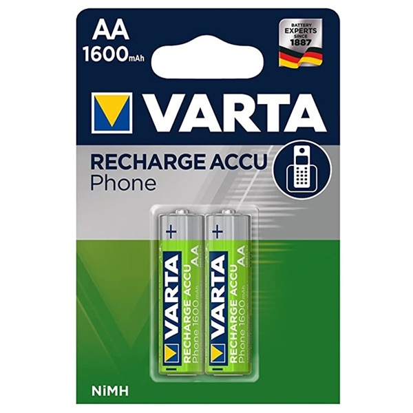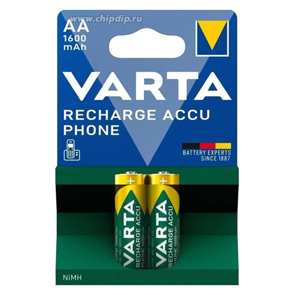 Никель-металлогидридные NiMH (Ni-MH) аккумуляторы Varta для беспроводных телефонов, типоразмера АА/HR6, емкостью 1600 мАч, упаковка 2 штуки 58399201402