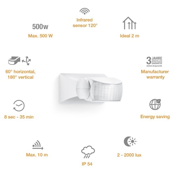Датчик движения инфракрасный Steinel IS 1, максимальная нагрузка 500 Ватт, дальность действия 10 метров, с углом охвата 120°, цвет белый 600310