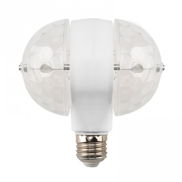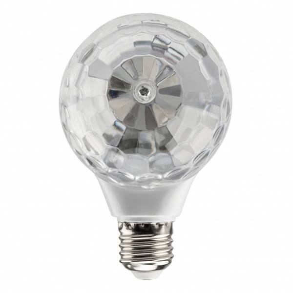 Светодиодная диско-лампа представляет собой устройство для создания эффекта светомузыки. Выполнена из пластикового корпуса в виде привычной лампочки, содержит внутри моторчик, который создает динамическое вращение потока разноцветных лучей.