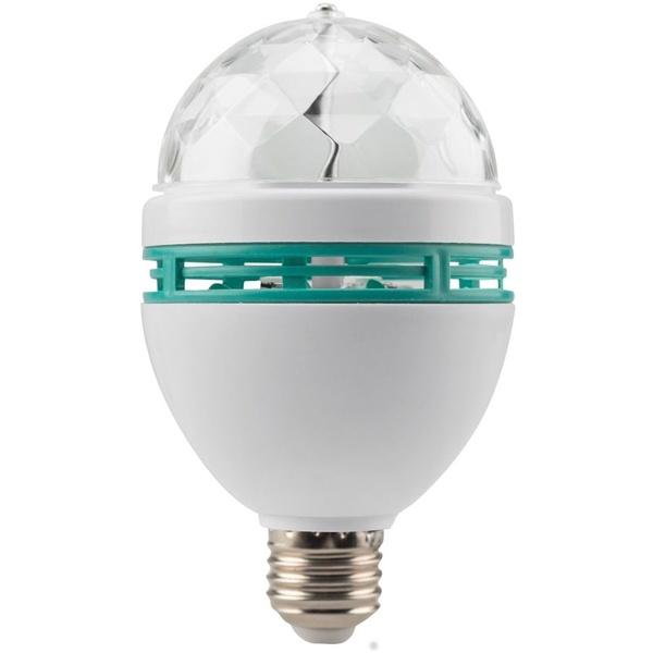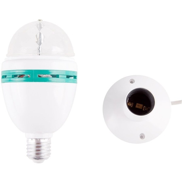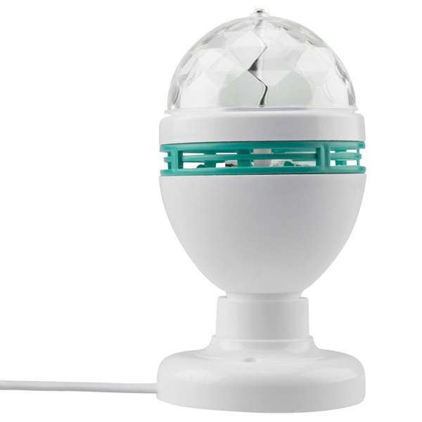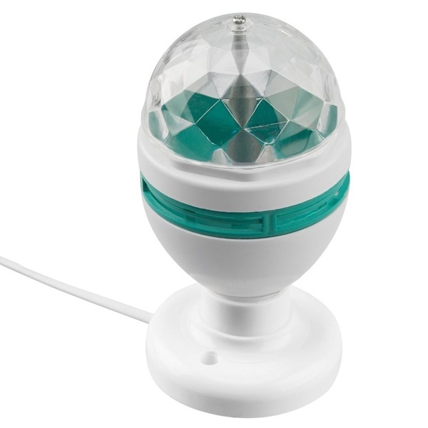 Пластиковая светодиодная диско-лампа, выполненная в форме эллипса, оборудована обычным классическим цоколем E27. Благодаря этому, диско-лампу можно эффективно использовать в обычных 220-Вольтных люстрах, торшерах, бра и многих других светильниках, устраивая веселые домашние, корпоративные или иные праздничные вечеринки. Кроме этого, лампу можно вкрутить в специальную подставку, которая идет в наборе с лампой с патроном под цоколь E27. Подставка оборудована электрическим шнуром с вилкой для розетки напряжением 220 Вольт. Благодаря этому диско-лампу можно установить на любую поверхность. Колба диско-лампочки делится на две половины. В нижней части находится светоизлучающая часть с несколькими разноцветными светодиодами и поворотным механизмом. Краткие технические характеристикиИсточник цвета – светодиоды. Напряжение электросети.– 220-230 ВольтУгол рассеивания – 280 градусов.Цоколь - E27.Тип свечения – рассеянный.Производитель - Neon-Night.