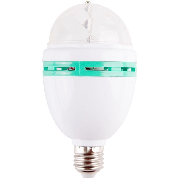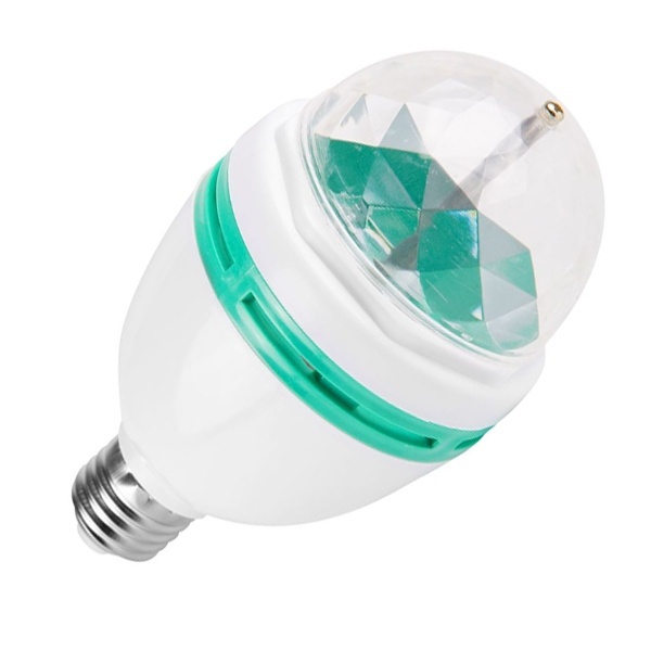 Диско-лампа светодиодная чаще всего используется для визуального формирования эффекта цветомузыки. Она изготовлена из пластика, имеет форму эллипса и оборудована обычным классическим цоколем E27. Благодаря этому, диско-лампу можно эффективно использовать в обычных 220-Вольных люстрах, торшерах, бра и многих других светильниках, устраивая веселые домашние вечеринки. Колба диско-лампочки делится на две половины. В нижней части находится светоизлучающая часть с несколькими разноцветными светодиодами и поворотным механизмом. Верхняя часть изделия выполнена в форме многогранного прозрачного колпака матового цвета. Мягкое, рассеянное свечение светодиодов при медленном вращении верхней части лампы озаряет находящиеся в помещении предметы разноцветными бликами приятного света. Краткие технические характеристикиИсточник цвета – светодиоды. Напряжение электросети.– 220-230 Вольт.Угол рассеивания – 280 градусов.Цоколь - E27.Тип свечения – рассеянный.Производитель - Neon-Night.