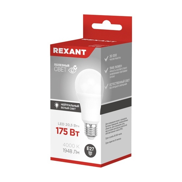 Лампа светодиодная 20.5Вт A60 грушевидная 4000К нейтр. бел. E27 1948лм Rexant 604-014