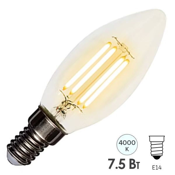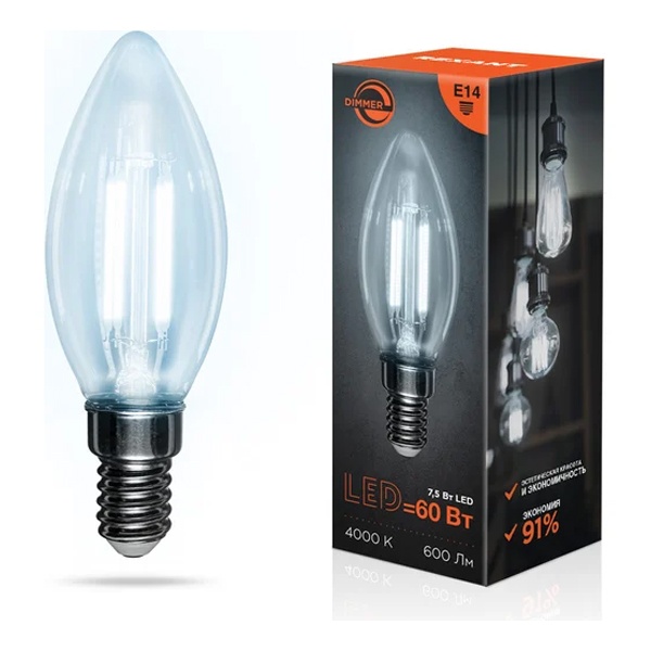 Филаментная лампочка свеча Рексант с нитевидными светодиодами, со ступенчатой регулировкой яркости, мощностью 7.5W, с цоколем E14, белый свет 604-088