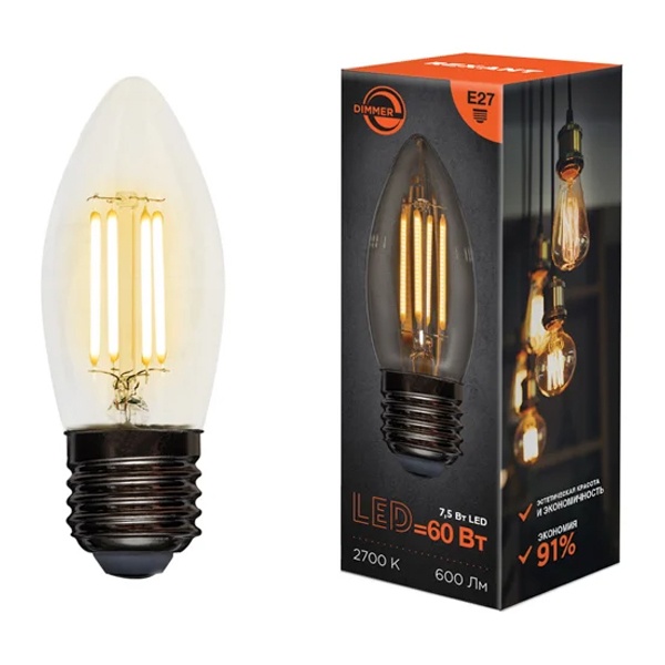 Филаментная лампочка свеча Рексант с нитевидными светодиодами, со ступенчатой регулировкой яркости, мощностью 7,5 Ватт, с цоколем E27, тёплый свет 604-089