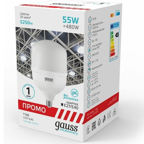 Светодиодная лампа промышленного освещения Гаусс, мощностью 55 Ватт, с цоколем E27/E40, холодный дневной свет 60436